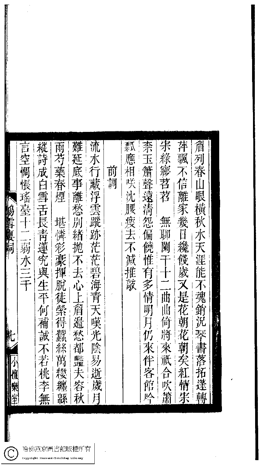 | (PRINT FRIENDLY VERSION) 小檀欒室彙刻閨秀詞﹕十集一百種一百卷(清徐乃昌輯) : 鴻雪樓詞﹕一卷。清光緒二十二年(1896)南陵徐氏刻本。 ![]() Page : 鴻雪樓詞.7a | click for larger image | Back |