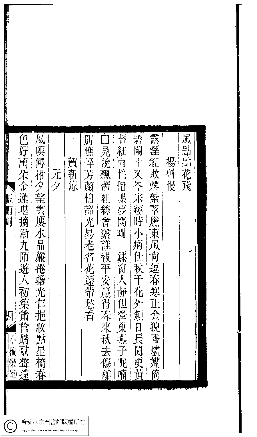 | (PRINT FRIENDLY VERSION) 小檀欒室彙刻閨秀詞﹕十集一百種一百卷(清徐乃昌輯) : 玉雨詞﹕一卷。清光緒二十二年(1896)南陵徐氏刻本。 ![]() Page : 玉雨詞.4a | click for larger image | 小檀欒室彙刻閨秀詞﹕十集一百種一百卷(清徐乃昌輯) : 玉雨詞﹕一卷。清光緒二十二年(1896)南陵徐氏刻本。![]() Page : 玉雨詞.3b | click for larger image | Back |