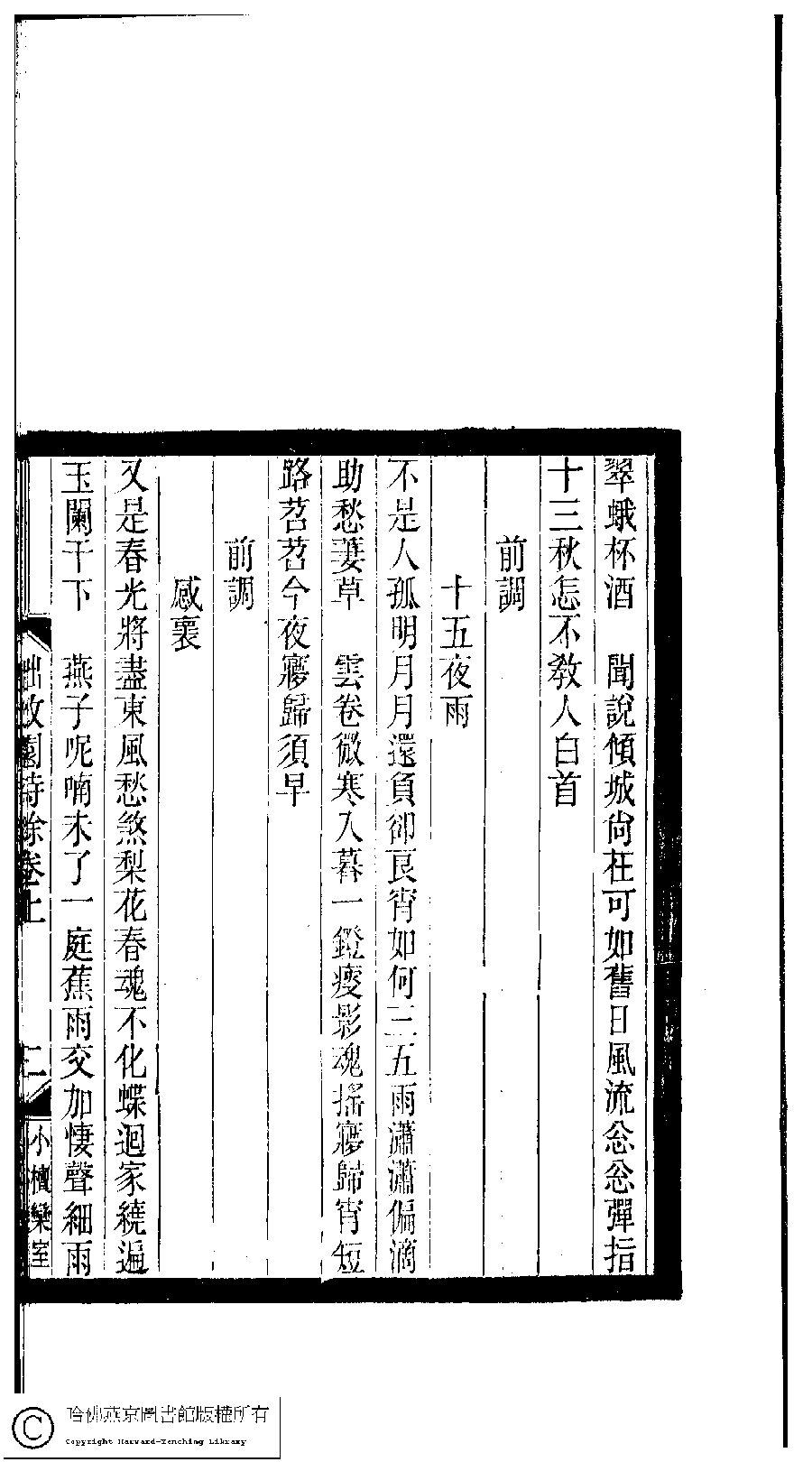 | (PRINT FRIENDLY VERSION) 小檀欒室彙刻閨秀詞﹕十集一百種一百卷(清徐乃昌輯) : 拙政園詩餘﹕三卷。清光緒二十二年(1896)南陵徐氏刻本。 ![]() Page : 卷上.2b | click for larger image | 小檀欒室彙刻閨秀詞﹕十集一百種一百卷(清徐乃昌輯) : 拙政園詩餘﹕三卷。清光緒二十二年(1896)南陵徐氏刻本。![]() Page : 卷上.2a | click for larger image | Back |