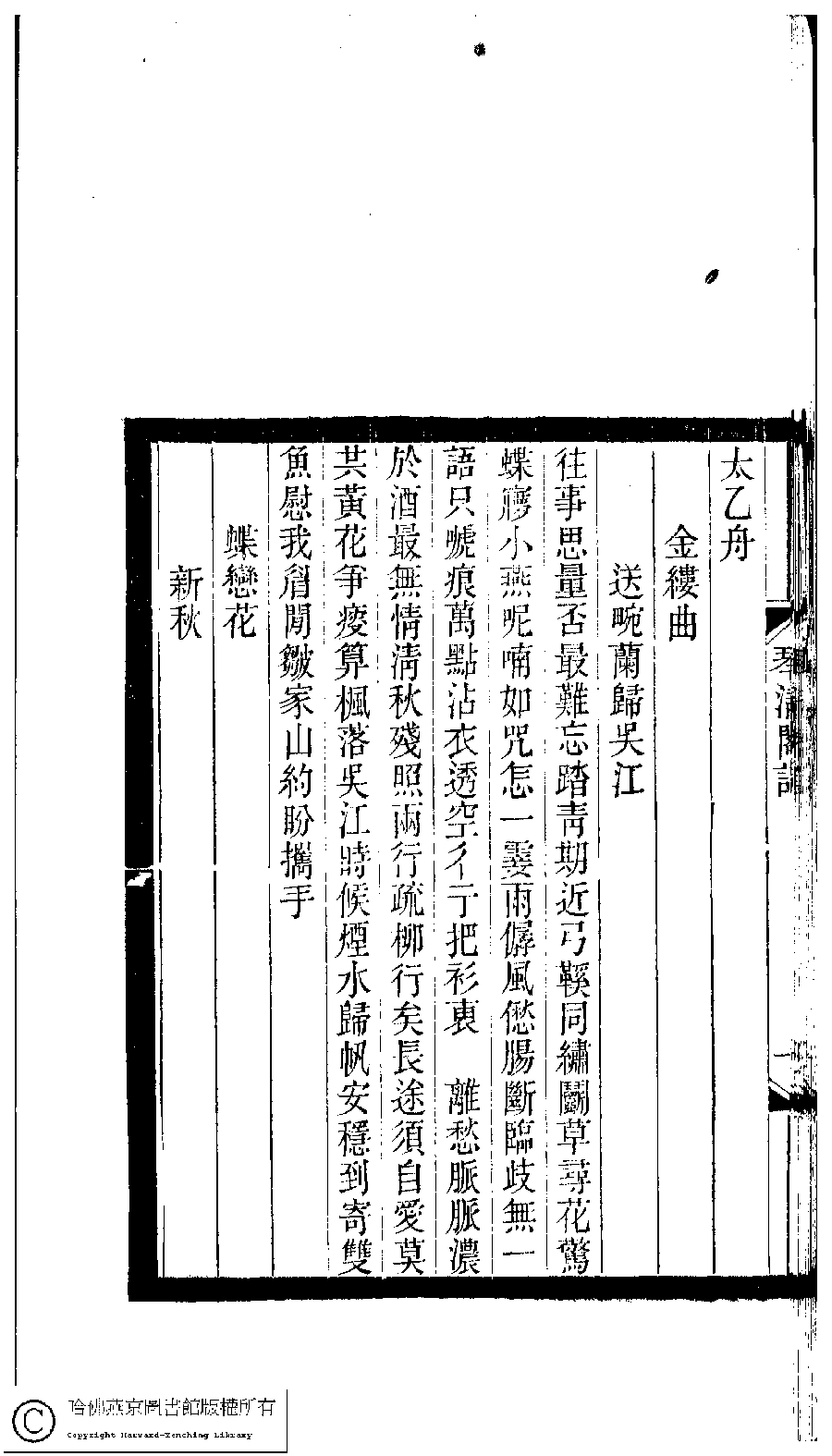 | Appears in: Xiao tan luan shi hui ke gui xiu ci: 10 ji 100 zhong 100 juan (edited by Xu Naichang, Qing dynasty): Qin qing ge ci: 1 juan |