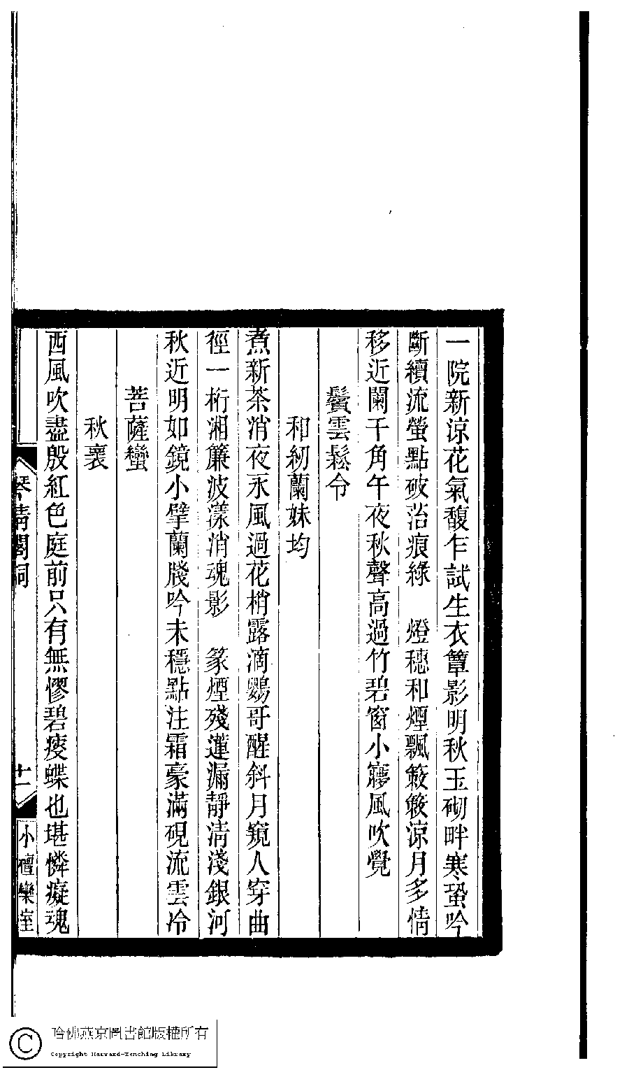 | (PRINT FRIENDLY VERSION) 小檀欒室彙刻閨秀詞﹕十集一百種一百卷(清徐乃昌輯) : 琴清閣詞﹕一卷。清光緒二十二年(1896)南陵徐氏刻本。 ![]() Page : 琴清閣詞.11a | click for larger image | Back |