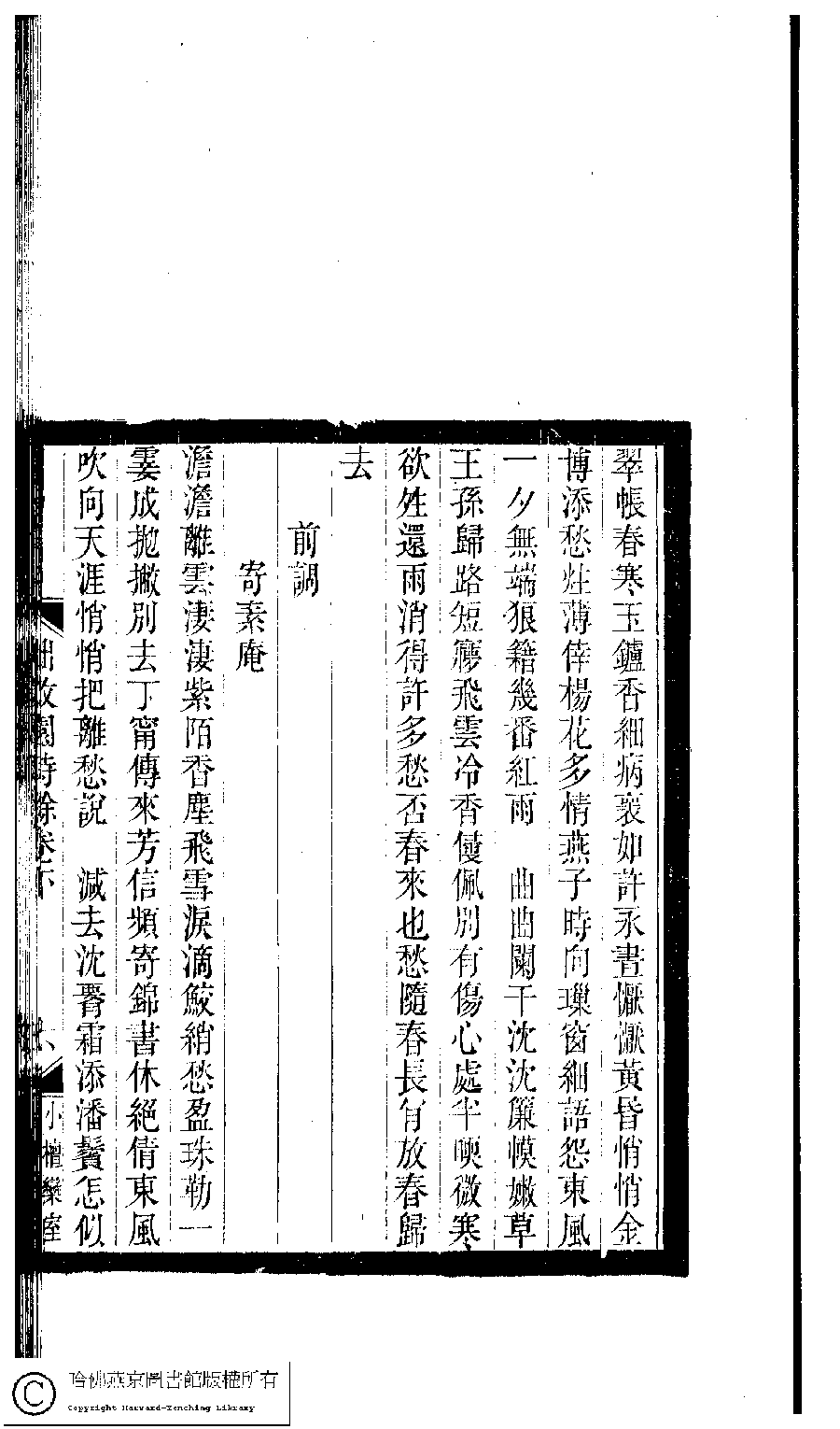 | (PRINT FRIENDLY VERSION) 小檀欒室彙刻閨秀詞﹕十集一百種一百卷(清徐乃昌輯) : 拙政園詩餘﹕三卷。清光緒二十二年(1896)南陵徐氏刻本。 ![]() Page : 卷下.6a | click for larger image | 小檀欒室彙刻閨秀詞﹕十集一百種一百卷(清徐乃昌輯) : 拙政園詩餘﹕三卷。清光緒二十二年(1896)南陵徐氏刻本。![]() Page : 卷下.5b | click for larger image | Back |
