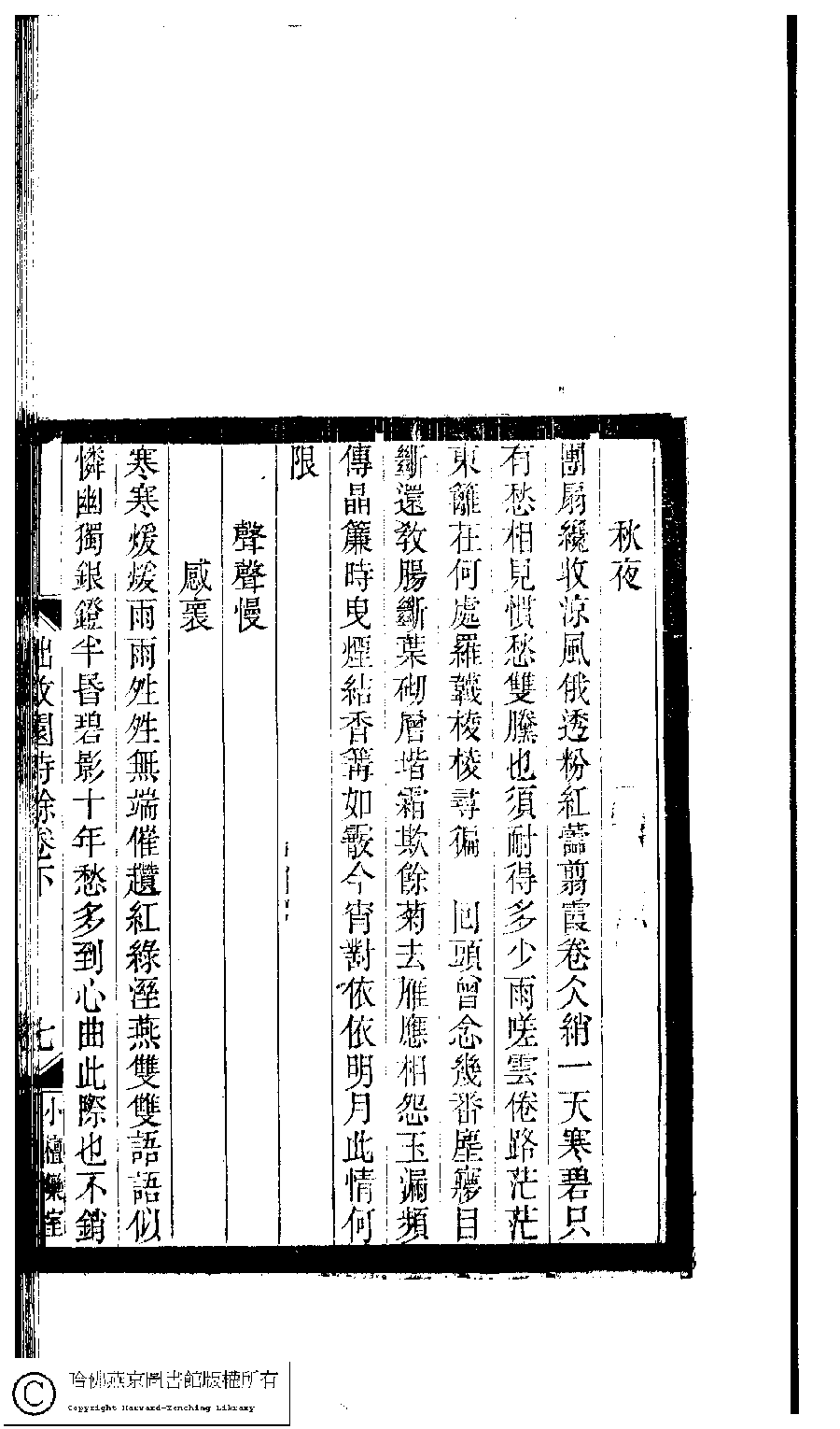 | (PRINT FRIENDLY VERSION) 小檀欒室彙刻閨秀詞﹕十集一百種一百卷(清徐乃昌輯) : 拙政園詩餘﹕三卷。清光緒二十二年(1896)南陵徐氏刻本。 ![]() Page : 卷下.7a | click for larger image | 小檀欒室彙刻閨秀詞﹕十集一百種一百卷(清徐乃昌輯) : 拙政園詩餘﹕三卷。清光緒二十二年(1896)南陵徐氏刻本。![]() Page : 卷下.6b | click for larger image | Back |