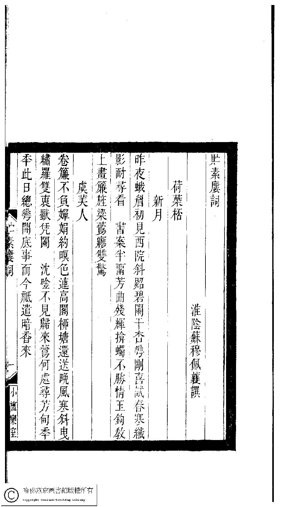 | (PRINT FRIENDLY VERSION) 小檀欒室彙刻閨秀詞﹕十集一百種一百卷(清徐乃昌輯) : 貯素樓詞﹕一卷。清光緒二十二年(1896)南陵徐氏刻本。 ![]() Page : 貯素樓詞.1a | click for larger image | Back |