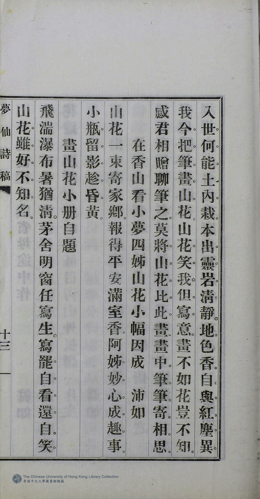 | (PRINT FRIENDLY VERSION) 夢僊詩稿:一卷, 續集: 一卷(清孫雲著)。民國十三年(1924)排印本 ![]() Page : Page 219 | click for larger image | Back |