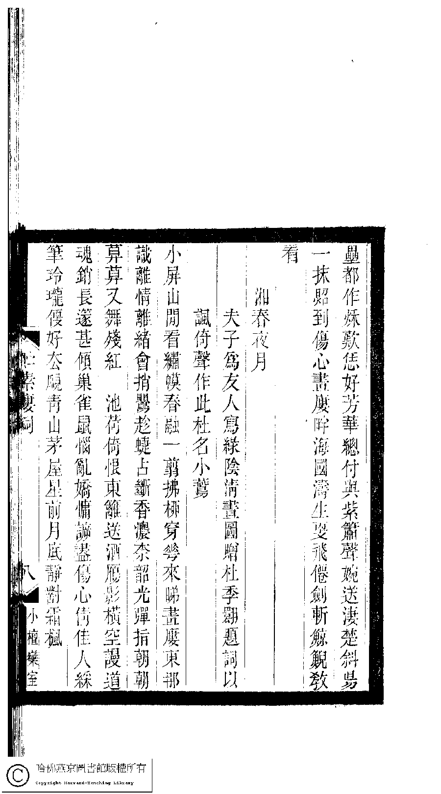 | (PRINT FRIENDLY VERSION) 小檀欒室彙刻閨秀詞﹕十集一百種一百卷(清徐乃昌輯) : 貯素樓詞﹕一卷。清光緒二十二年(1896)南陵徐氏刻本。 ![]() Page : 貯素樓詞.8a | click for larger image | Back |