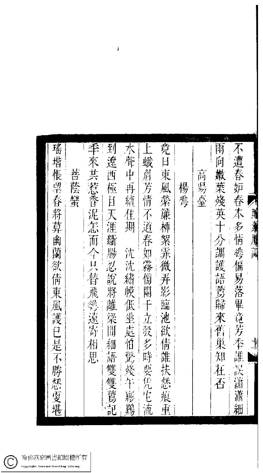| (PRINT FRIENDLY VERSION) 小檀欒室彙刻閨秀詞﹕十集一百種一百卷(清徐乃昌輯) : 貯素樓詞﹕一卷。清光緒二十二年(1896)南陵徐氏刻本。 ![]() Page : 貯素樓詞.12a | click for larger image | 小檀欒室彙刻閨秀詞﹕十集一百種一百卷(清徐乃昌輯) : 貯素樓詞﹕一卷。清光緒二十二年(1896)南陵徐氏刻本。![]() Page : 貯素樓詞.11b | click for larger image | Back |