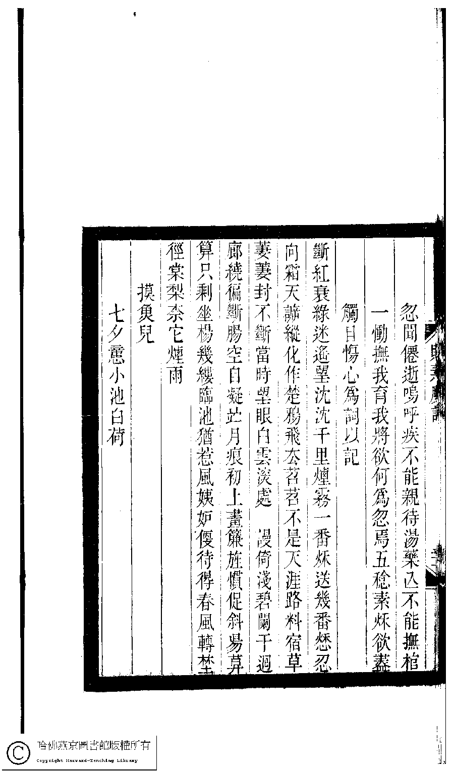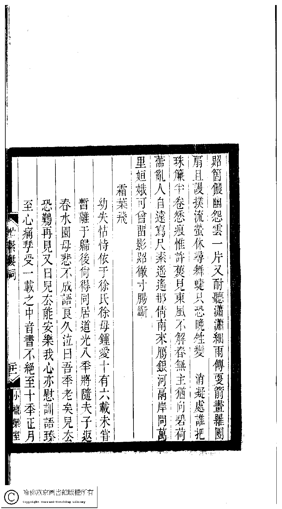 | (PRINT FRIENDLY VERSION) 小檀欒室彙刻閨秀詞﹕十集一百種一百卷(清徐乃昌輯) : 貯素樓詞﹕一卷。清光緒二十二年(1896)南陵徐氏刻本。 ![]() Page : 貯素樓詞.21b | click for larger image | 小檀欒室彙刻閨秀詞﹕十集一百種一百卷(清徐乃昌輯) : 貯素樓詞﹕一卷。清光緒二十二年(1896)南陵徐氏刻本。![]() Page : 貯素樓詞.21a | click for larger image | Back |