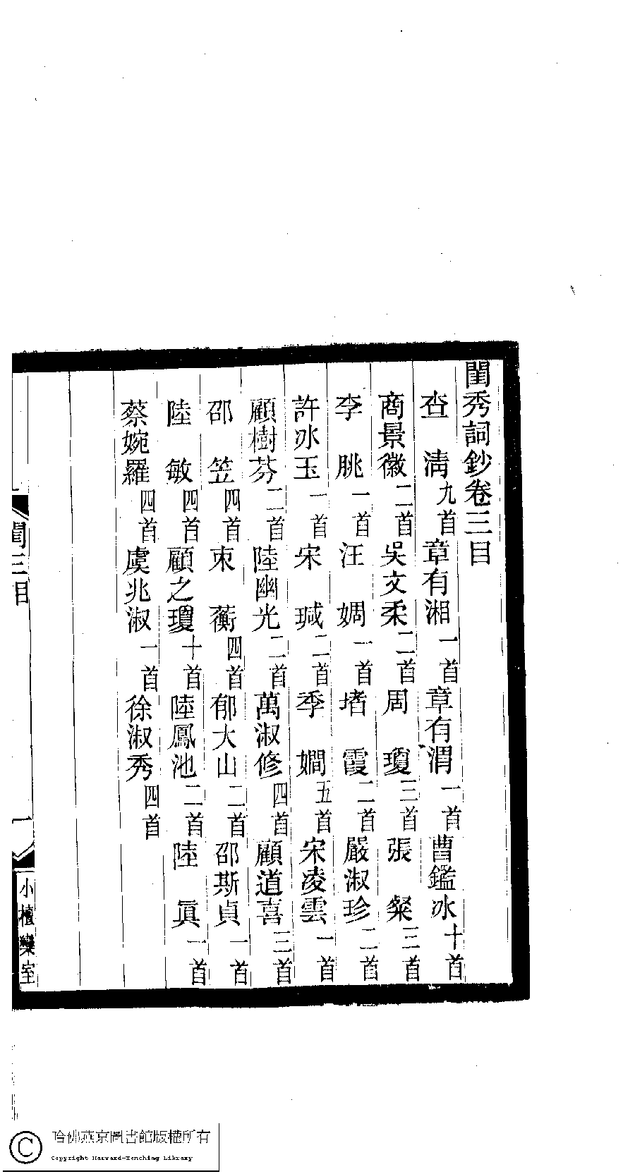 | (PRINT FRIENDLY VERSION) 閨秀詞鈔﹕十六卷(清徐乃昌輯)。清宣統元年(1909)小檀欒室刻本。 ![]() Page : 3.目.1b | click for larger image | 閨秀詞鈔﹕十六卷(清徐乃昌輯)。清宣統元年(1909)小檀欒室刻本。![]() Page : 3.目.1a | click for larger image | Back |