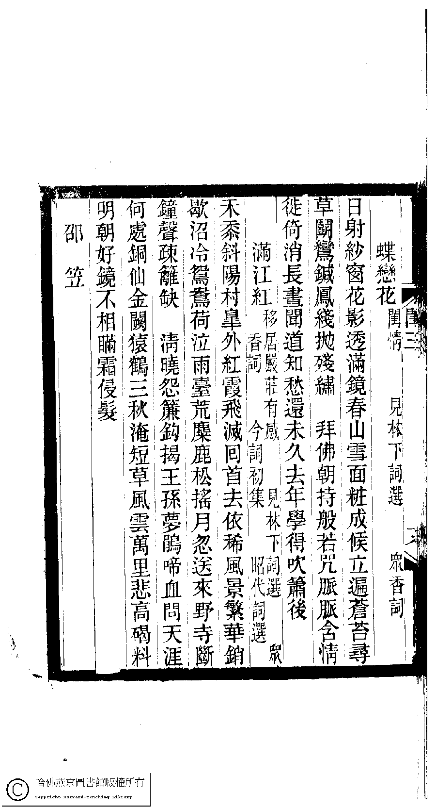 | (PRINT FRIENDLY VERSION) 閨秀詞鈔﹕十六卷(清徐乃昌輯)。清宣統元年(1909)小檀欒室刻本。 ![]() Page : 3.19a | click for larger image | 閨秀詞鈔﹕十六卷(清徐乃昌輯)。清宣統元年(1909)小檀欒室刻本。![]() Page : 3.18b | click for larger image | Back |